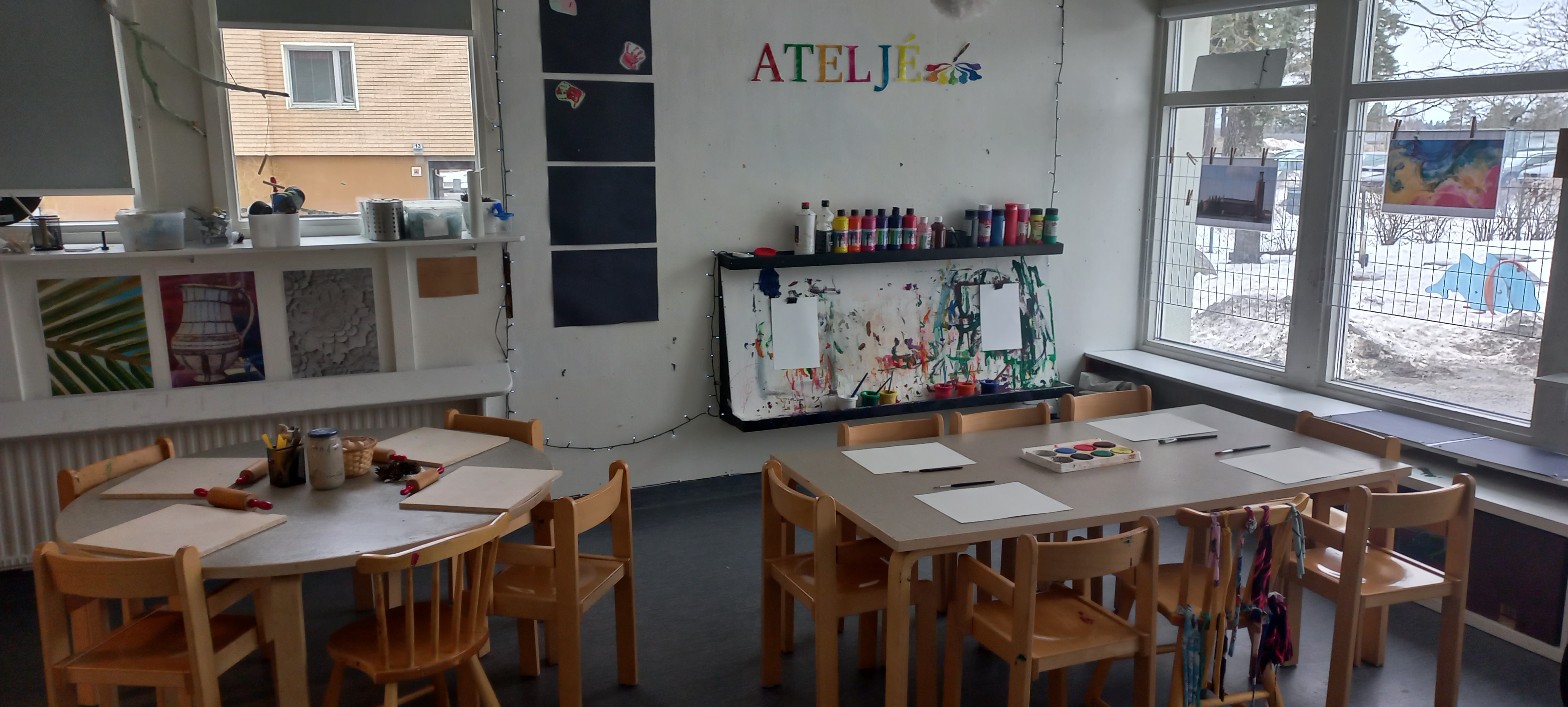 I ateljén arbetar vi med olika skapande former såsom lera, måla med färg och temperafärg. Barnen lär sig att ta ansvar för materialet och uttrycker olika konstformer.