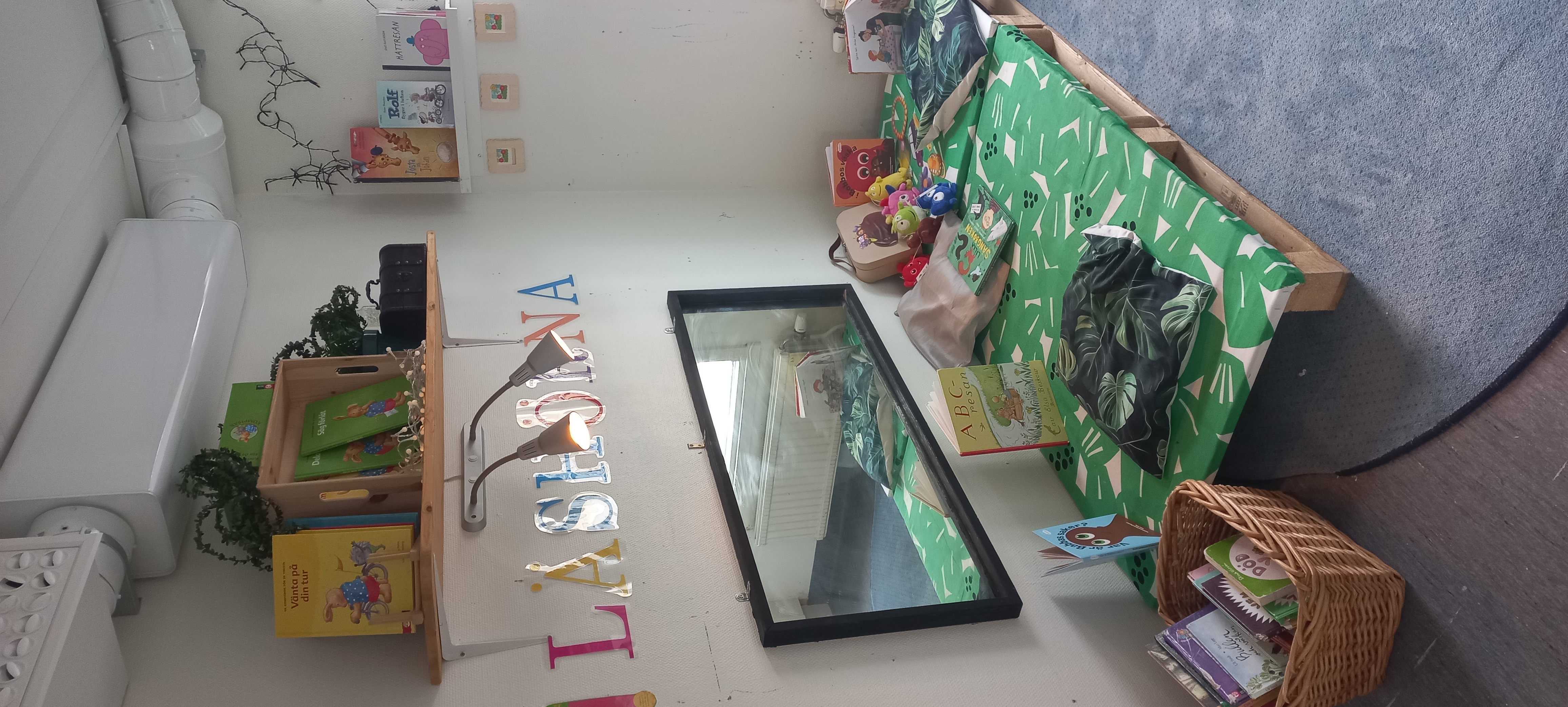 Inne i läshörnan har vi högläsning i olika bokgenrer som stimulerar barnens språkutveckling och vi arbetar till vardags med TAKK.